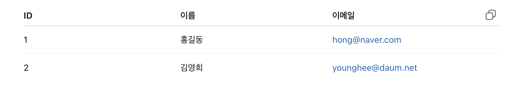 - 행 = 하나의 데이터 / 열 = 속성 (예: 이름, 이메일, 전화번호)